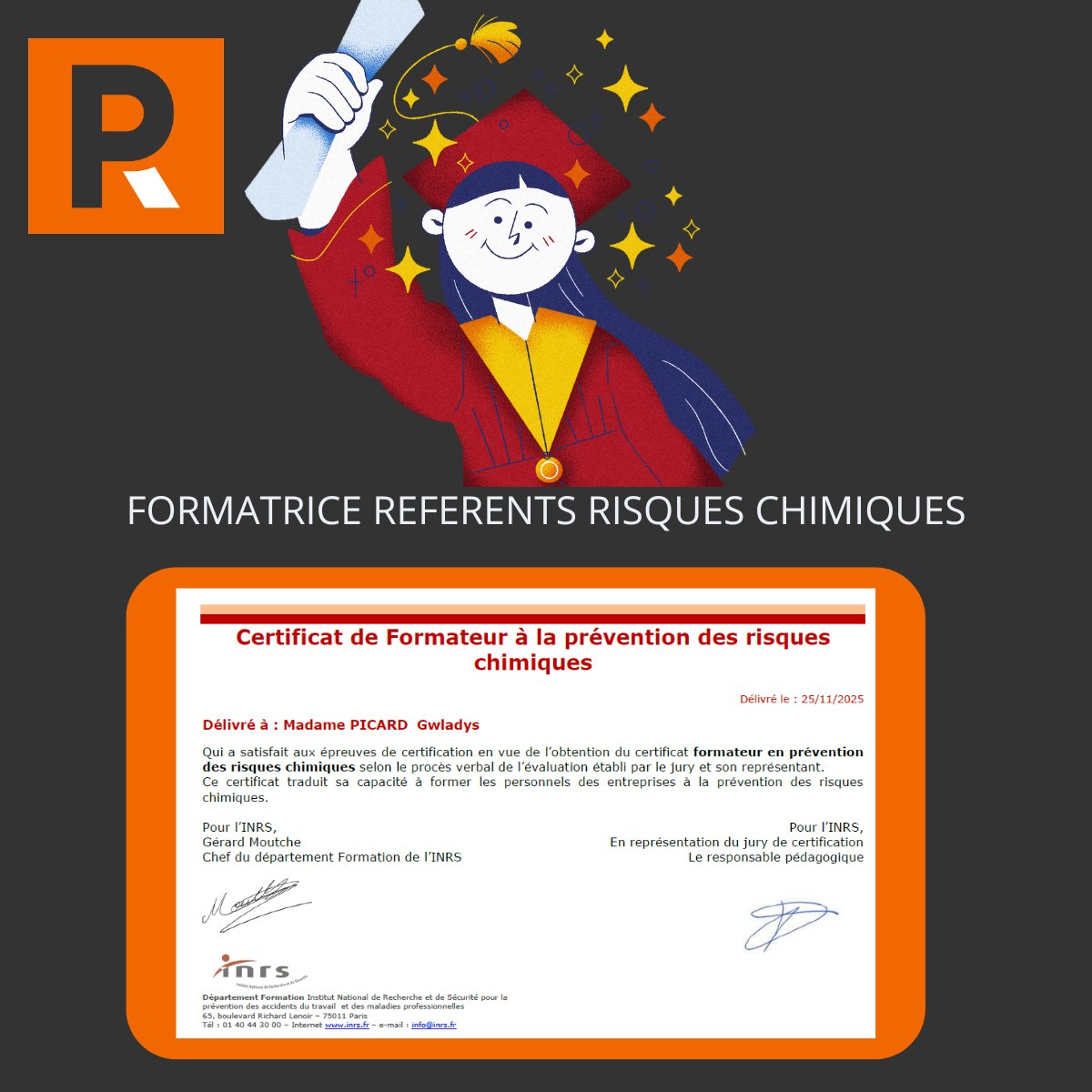 Afin de compléter mes interventions, je suis désormais certifiée par l’INRS en tant que formatrice Risques chimiques